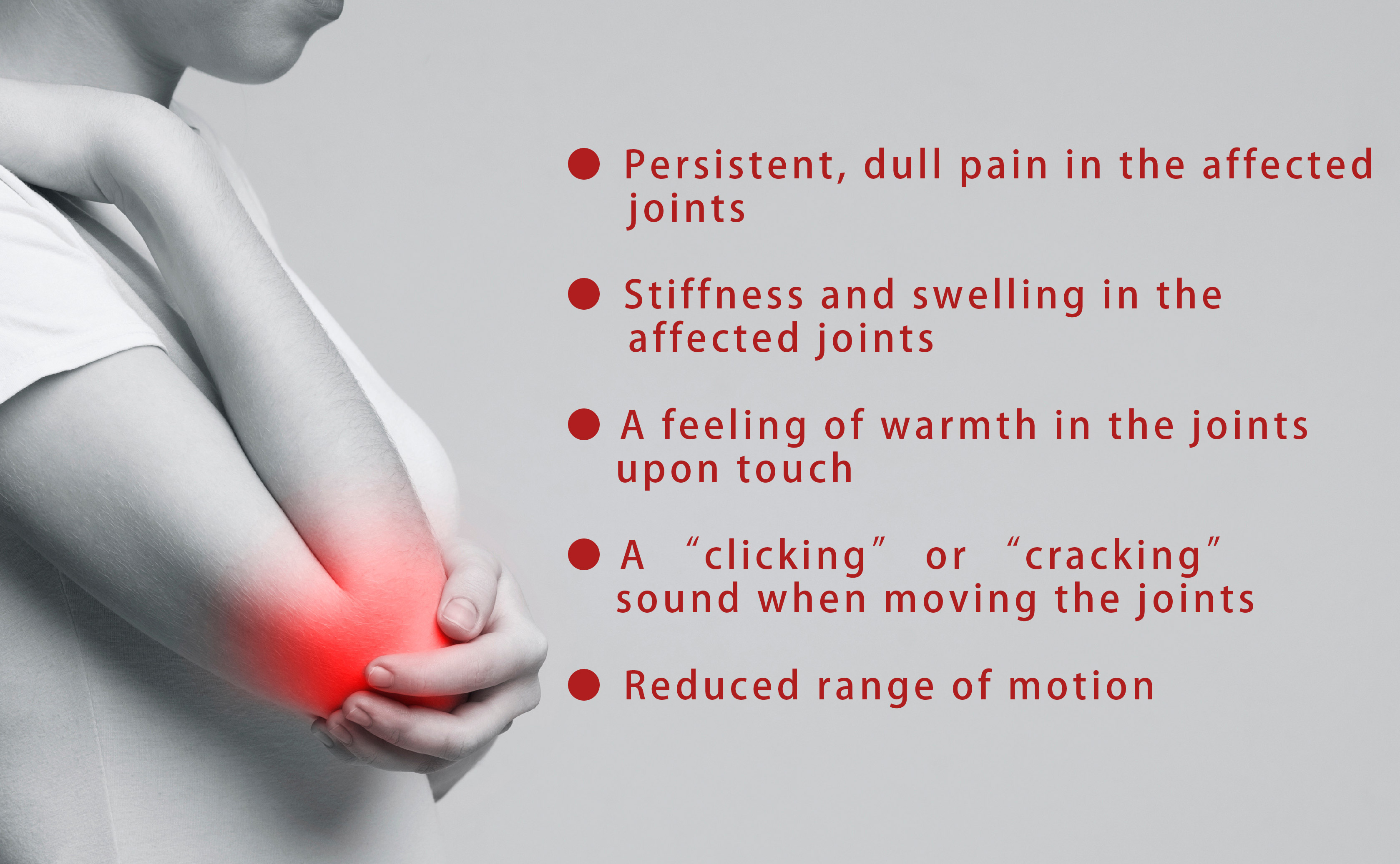 · This is the most common form of arthritis, often described as “wear and tear” of the joints. Over time, the cartilage within the joints begins to wear down, leading to direct friction between bones. This results in joint pain, stiffness or swelling.