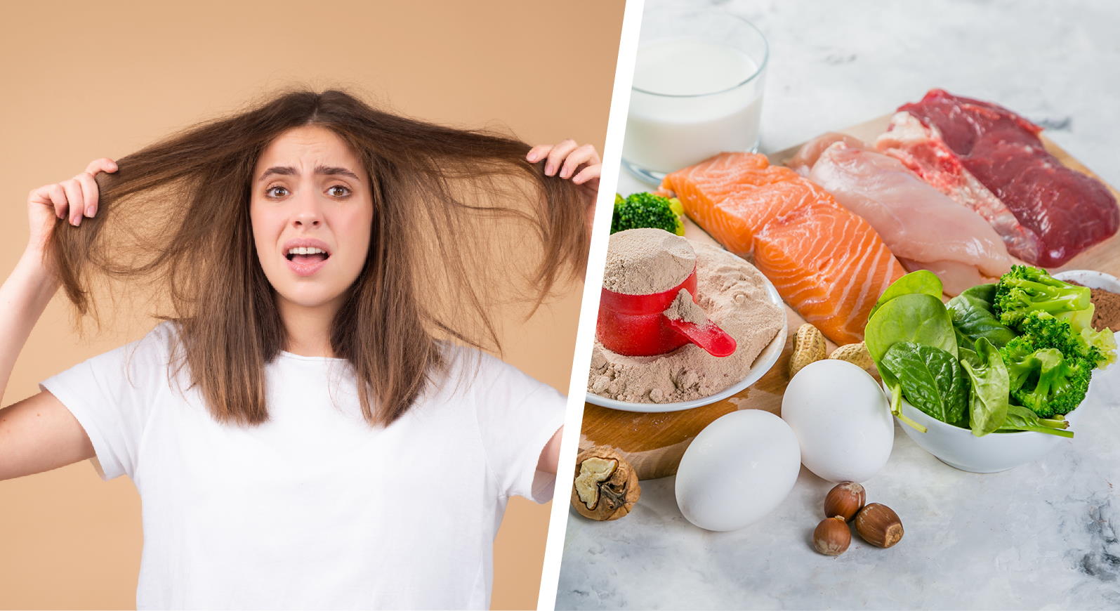 Hair is primarily made up of protein, deficiencies in nutrients not only affecting your body health but the hair quality too. Inadequate protein intake can result in frizzy, brittle and hair loss. Thus, a well-rounded diet is an important factor for healthy hair and scalp. Good sources of protein include: eggs, beans, fish, low-fat dairy products, nuts and fish.