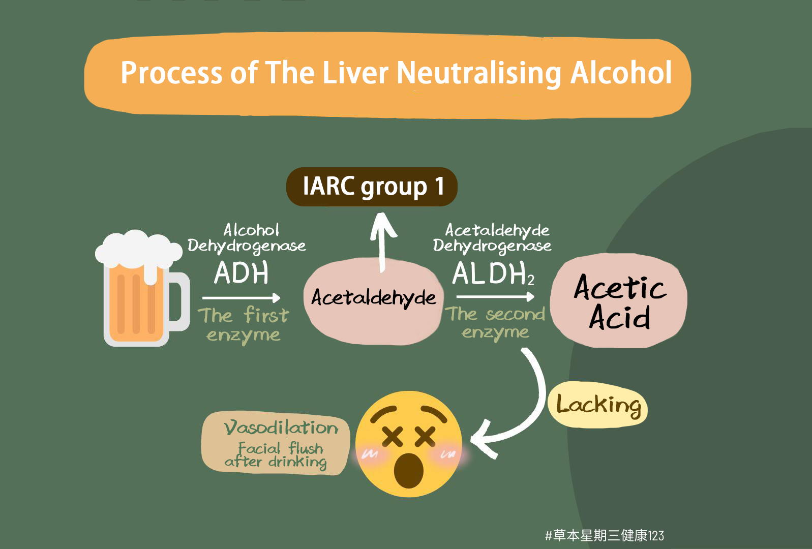 Therefore, we need the second enzyme, Acetaldehyde Dehydrogenase (ALDH2) to break down the carcinogen (acetaldehyde) into acetic acid so that it can be discharged out of our body.