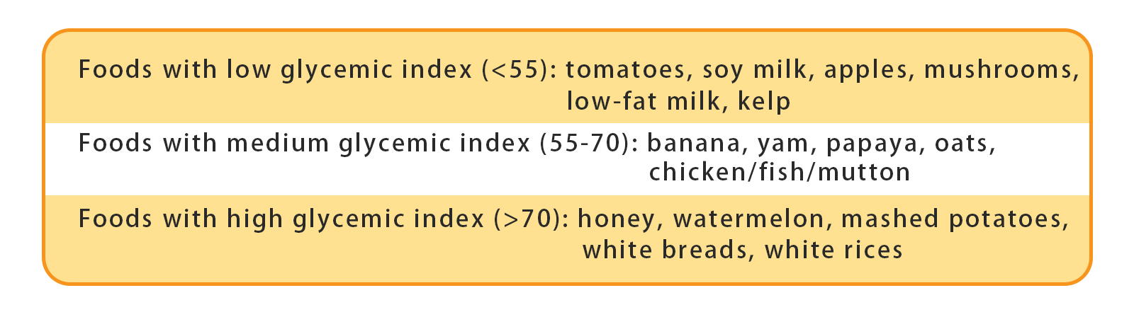 During digestion, carbohydrates with high glycemic index will break down quickly and the glucose will be released into blood and the blood sugar level will be driven. However, carbohydrates with low glycemic index will break down much slower and release the glucose into our blood, but it may take longer time for the blood sugar level to rise.