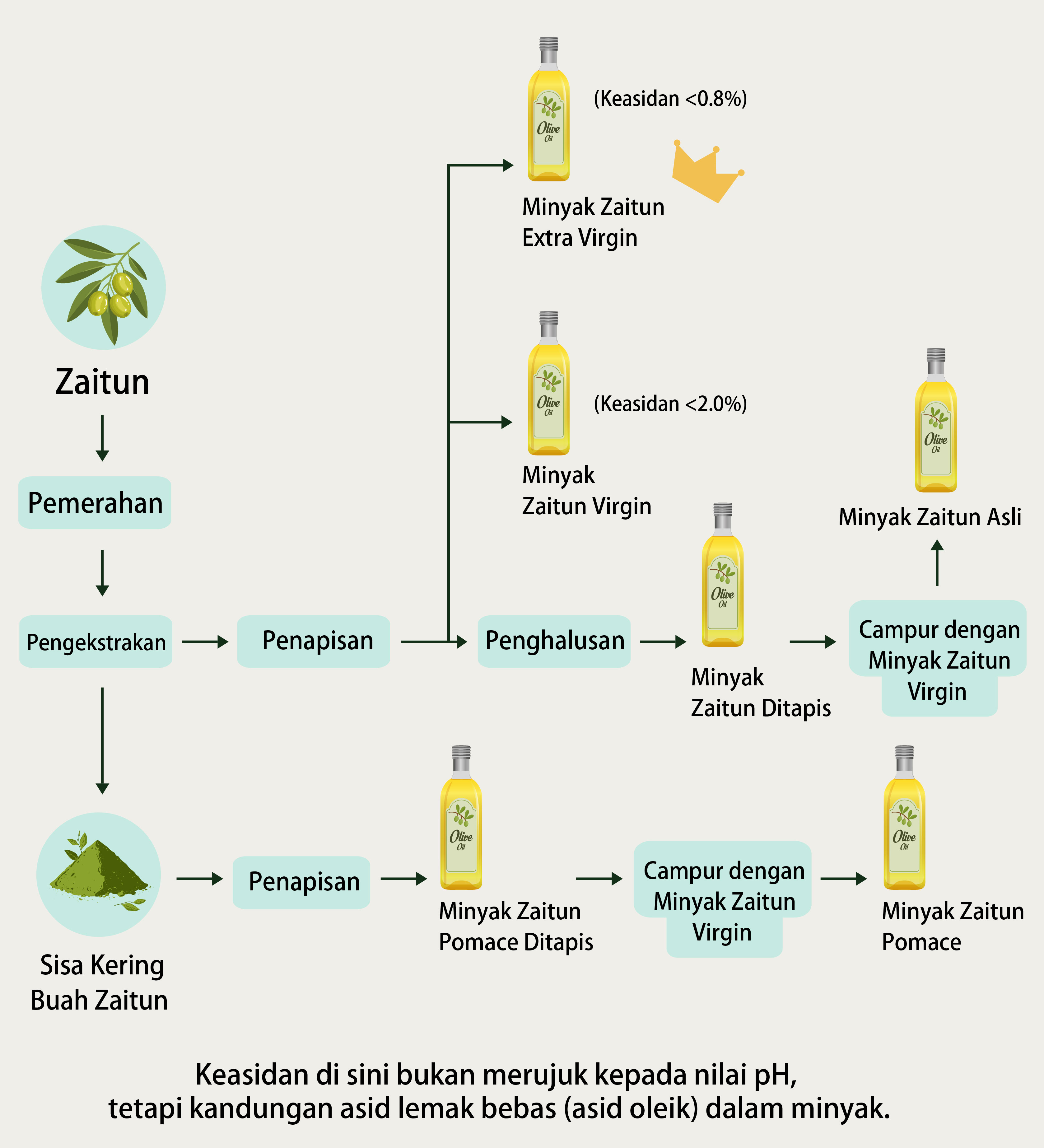· Mengandungi kandungan asid oleik kurang daripada 2.0% dengan kualiti yang lebih rendah berbanding minyak zaitun extra virgin
