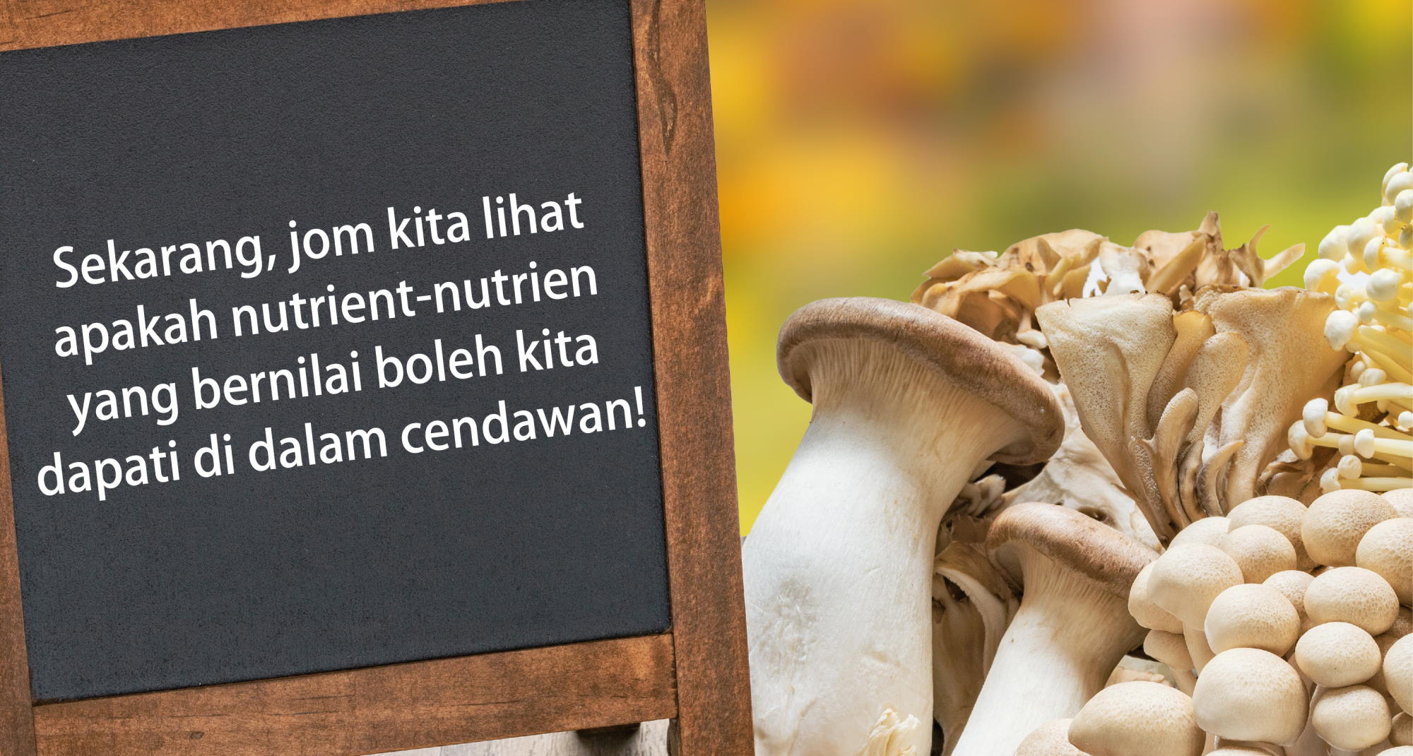 Cendawan yang sentiasa didapati merangkumi shiitake, cendawan king oyster, cendawan butang, cendawan mane singa, cendawan kulat hitam, cendawan jamur merang, cendawan enoki, cendawan tremella (kulat putih), cendawan shimeji dan spesies-spesies yang lain. Cendawan adalah kaya dengan vitamin, ia juga adalah rendah sodium dan tinggi potassium. Ion potassium di dalam serum darah membantu mengawal pengecutan otot kita, terutamanya otot jantung. Apabila ion potassium bermula kehabisan, masalah kekejangan akan berlaku. Sekarang, jom kita lihat apakah nutrient-nutrien yang bernilai boleh kita dapati di dalam cendawan!