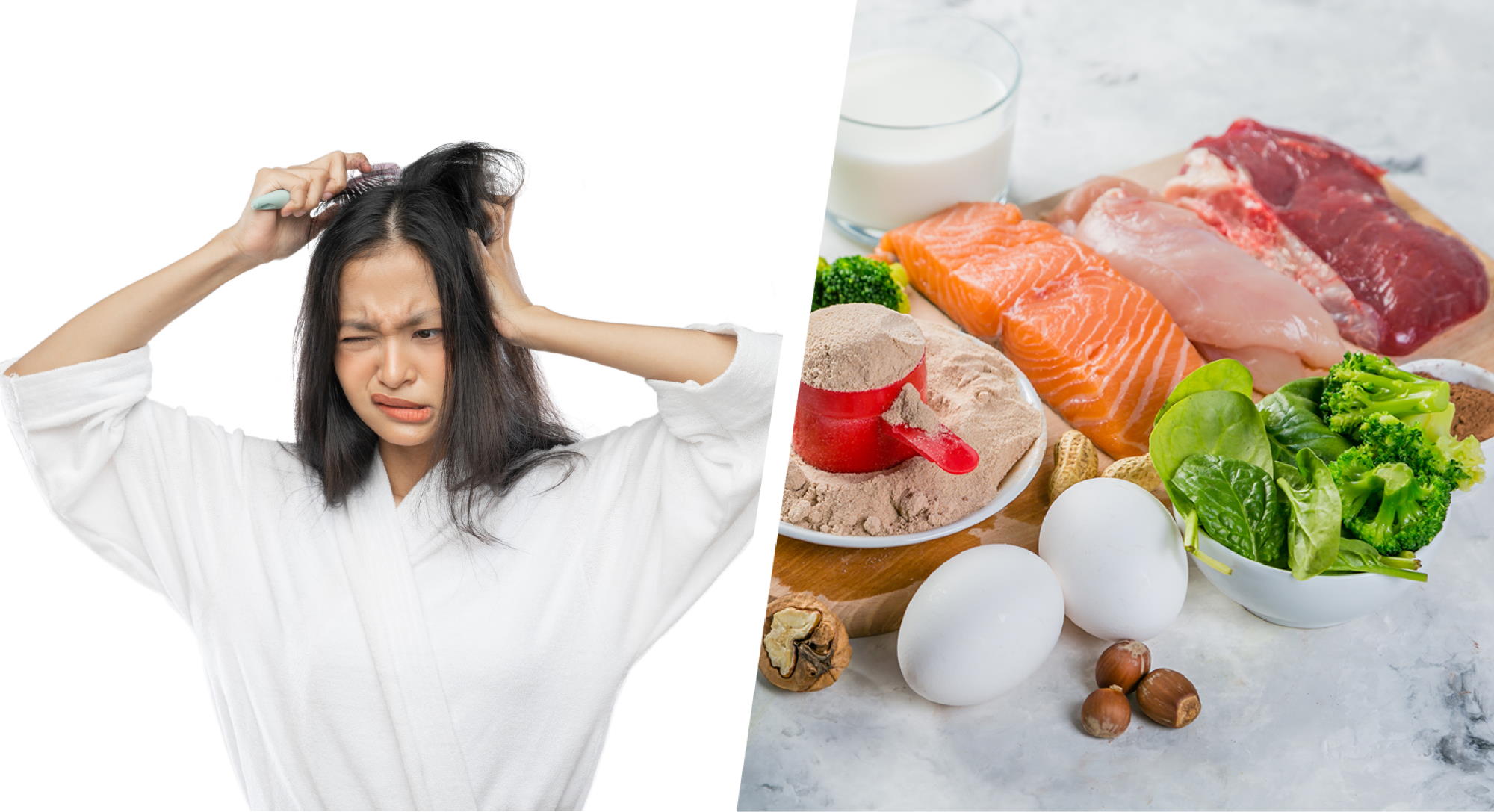 Rambut adalah terutamanya dibentuk daripada protein, ketidakcukupan khasiat bukan sahaja akan mempengaruhi kesihatan anda tetapi juga kualiti rambut anda. Pengambilan protein yang tidak cukup akan menyebabkan rambut keriting, rapuh dan juga keguguran rambut. Oleh itu, pemakanan yang seimbang ialah faktor yang sangat penting untuk rambut dan kulit kepala yang sihat. Punca protein merangkumi: telur, kacang (beans), ikan, produk tenusu lemak rendah, kacang (nuts).