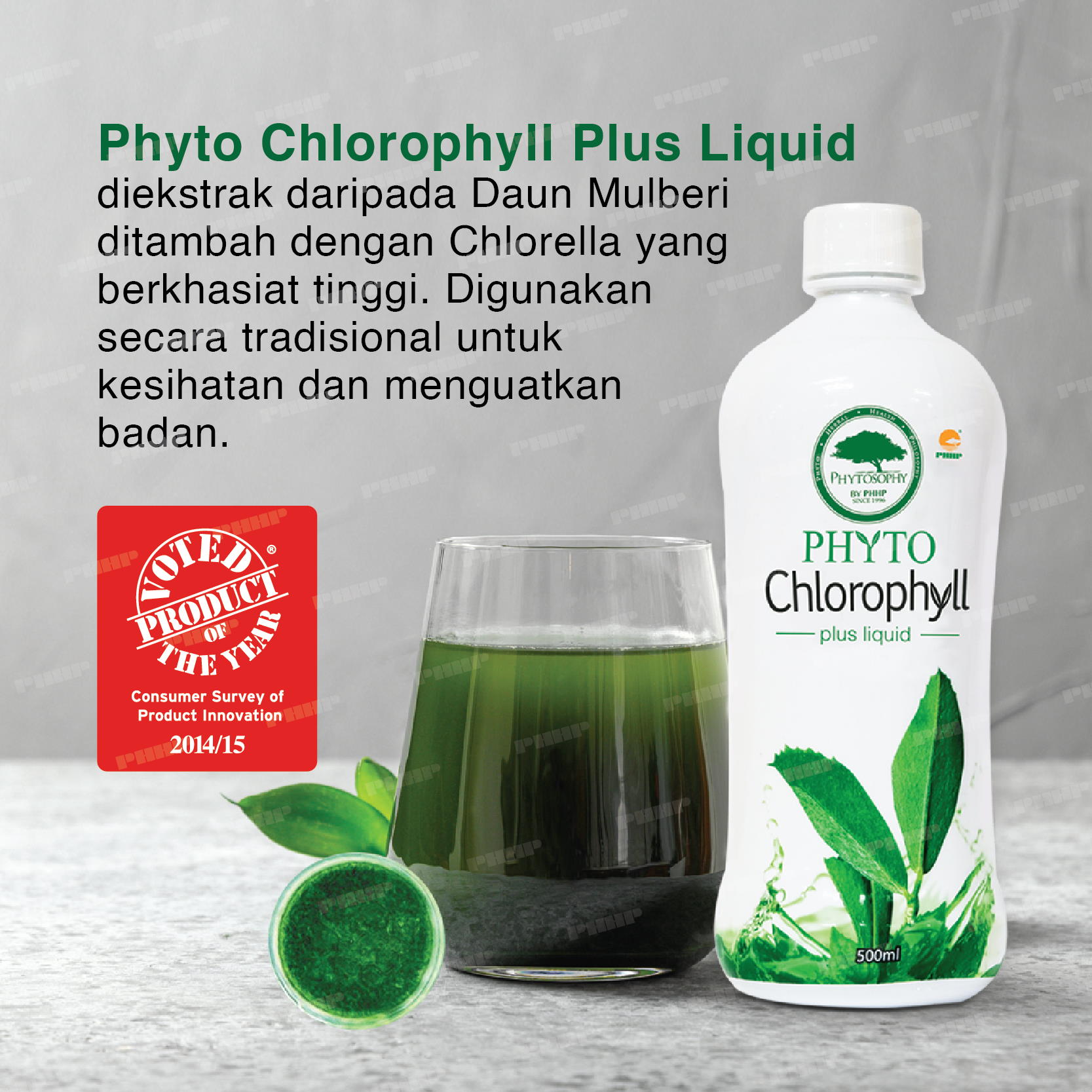Bukan itu sahaja, klorofil telah digunakan secara tradisional untuk kesihatan dan menguatkan tubuh badan. Phyto Chlorophyll Plus Liquid terdiri daripada daun Mulberi dan ditambah dengan Chlorella untuk minuman yang sihat.
