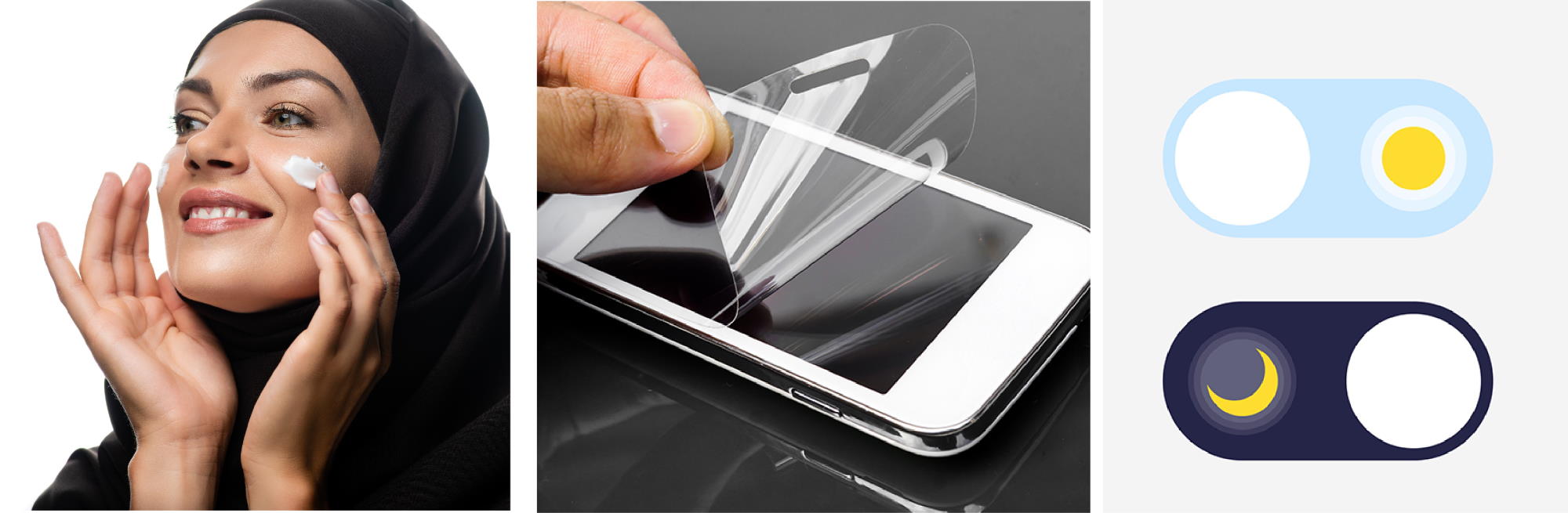 Selain daripada komputer, produk komunikasi dan produk elektronik pengguna (produk 3C), diod pemancar cahaya (LED) dan lampu pendarfluor juga memancarkan cahaya biru. Kita sudah mengetahui bahawa memandang telefon bimbit dan tablet dalam tempoh yang lama akan menjejaskan kesihatan mata kita, ia akan menyebabkan tanda-tanda seperti mata kering, mengalir air mata dan juga sakit kepala. Namun, tahukah anda ia juga akan memudaratkan kesihatan kulit kita?