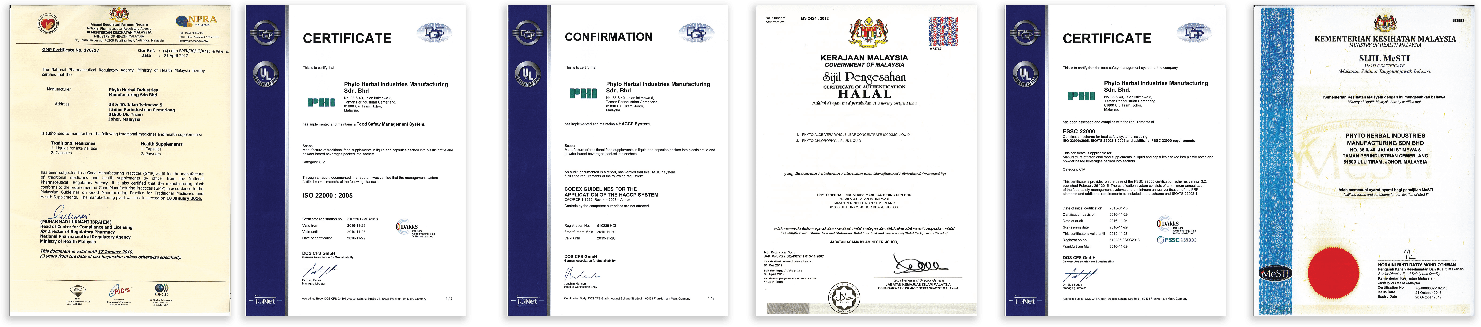 PHI manufacturing facilities have been proven to meet international quality standards. PHI is certified with Good Manufacturing Practice standards (GMP) by the National Pharmaceutical Regulatory Agency of Malaysia (NPRA), ISO 22000 Food Safety Management System and HACCP System as well as certified Halal by Malaysia Halal Authority (JAKIM).