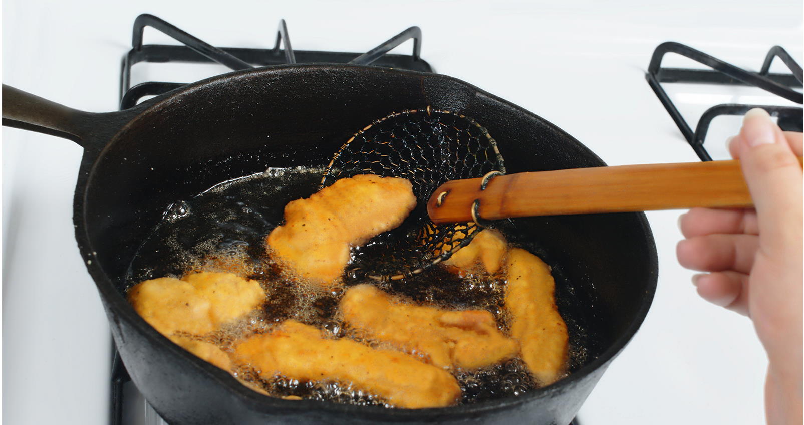 煎炸⻝物时油的温度很⾼,油在锅⾥冒烟时温度可达到 220℃。在如此⾼温的情况下,⼀般建议在煎炸的⻝物上涂上⾯糊或者⾯包糠,在下油锅时淀粉会很快被煎熟结成硬块,可达到减少营养素流失的作⽤。油炸的⻝物⼀般上热量很⾼,⽽⾼温烹煮可能产⽣的致癌物也更多,不建议⻓期⻝⽤。