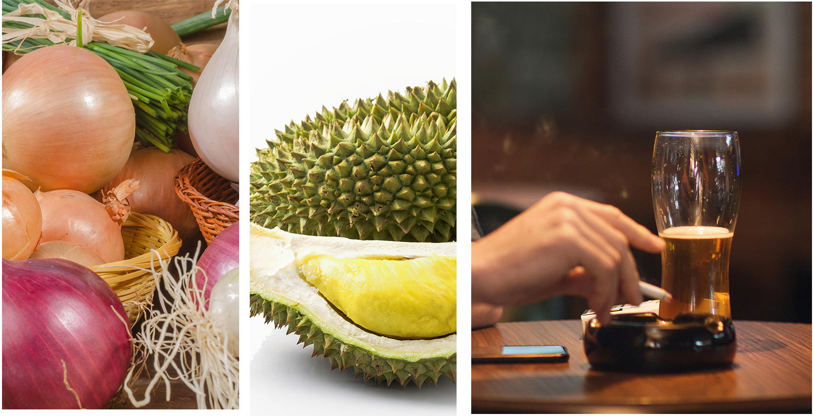 爱吃洋葱、大蒜、芦笋、榴莲等味道较强烈的食物会导致暂时性口臭情况。另外,经常有抽烟喝酒习惯的人群多数患有口臭问题。